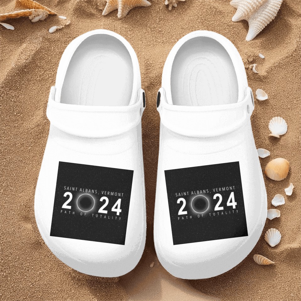 You're taking a peek at the product Saint Albans Vermont 2024 Eclipse Souvenir Cool Nurse Clogs For Men WHITE belong theme Nurse Clogs at Printblur