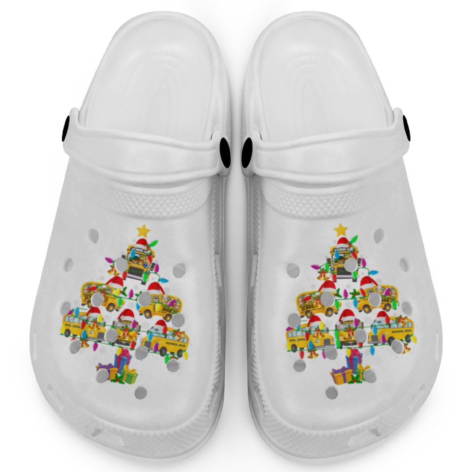 The item hot trend you're looking at is School Bus Christmas Tree Funny Santa Bus Driver Clogs For Kids WHITE belong theme Clogs at Printblur