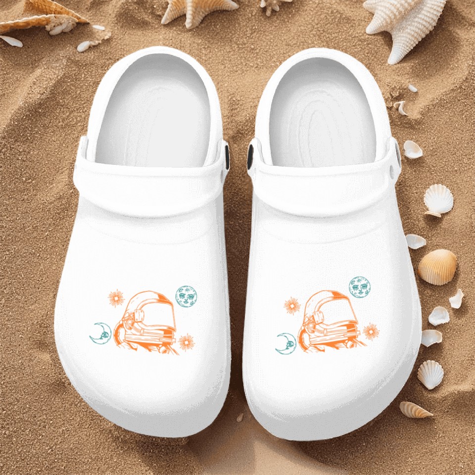 The product unique design you searched for is Science Astronaut Moon Sun Nurse Clogs For Men WHITE belong theme Nurse Clogs at Printblur