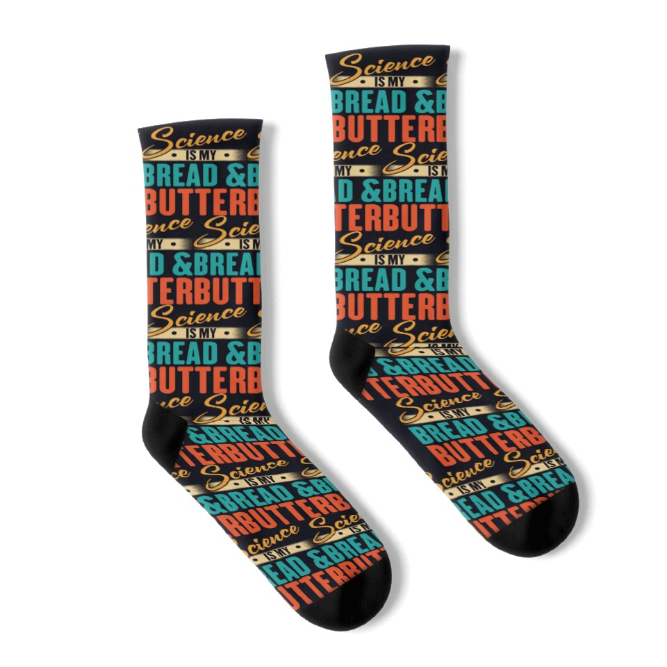 You're looking at the eye-catching product Science Is My Bread And Butter - Funny Scientist Socks For Black belong theme Socks at Printblur