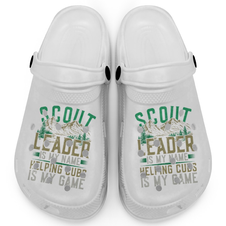 The product unique design you searched for is Scout Leader Is My Name Helping Cubs Is My Game Clogs For Kids WHITE belong theme Clogs at Printblur