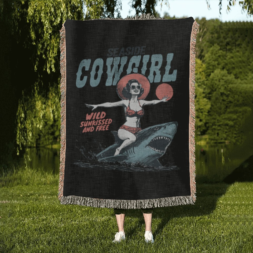 You are viewing one of the trendiest products Seaside Cowgirl Shark Adventure retro summer Woven Blankets For Black belong theme Woven Blankets at Printblur