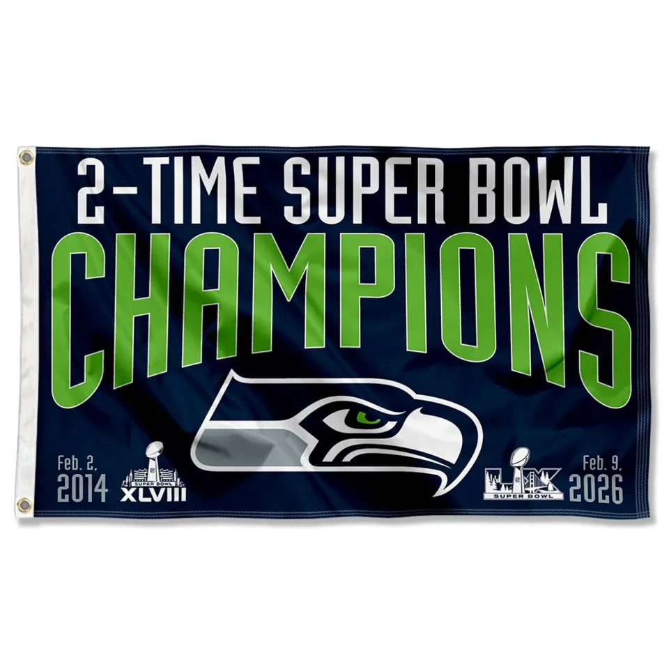 Shop for attractive Seattle Seahawks 2 Time Super Bowl Champions Flag or see more House Flags products on https://printblur.com right now!