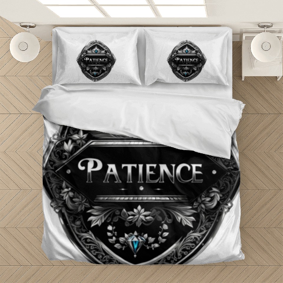 Buy stunning SILVER BLACK PATIENCE TEXT AI GENERATED Bedding Sets or see more Bedding Sets products at Printblur right now to receive many amazing discounts!