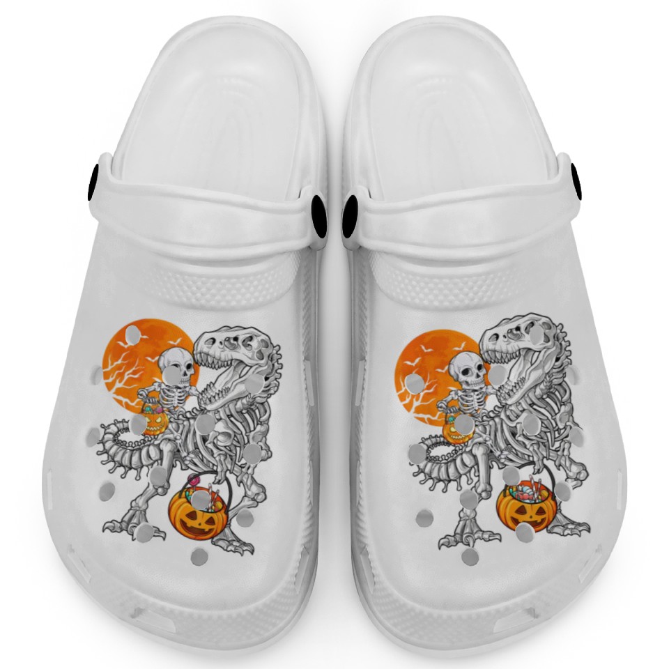 You're taking a peek at the product Skeleton Dinosaur T rex Boys Funny Halloween Mummy Clogs For Kids WHITE belong theme Clogs at Printblur