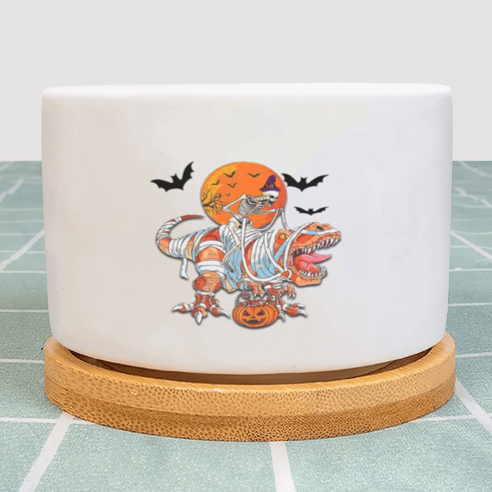 You're looking at the eye-catching product Skeleton Riding Mummy Dinosaurs T Rex Halloween Plant Pots For WHITE belong theme Plant Pots at Printblur