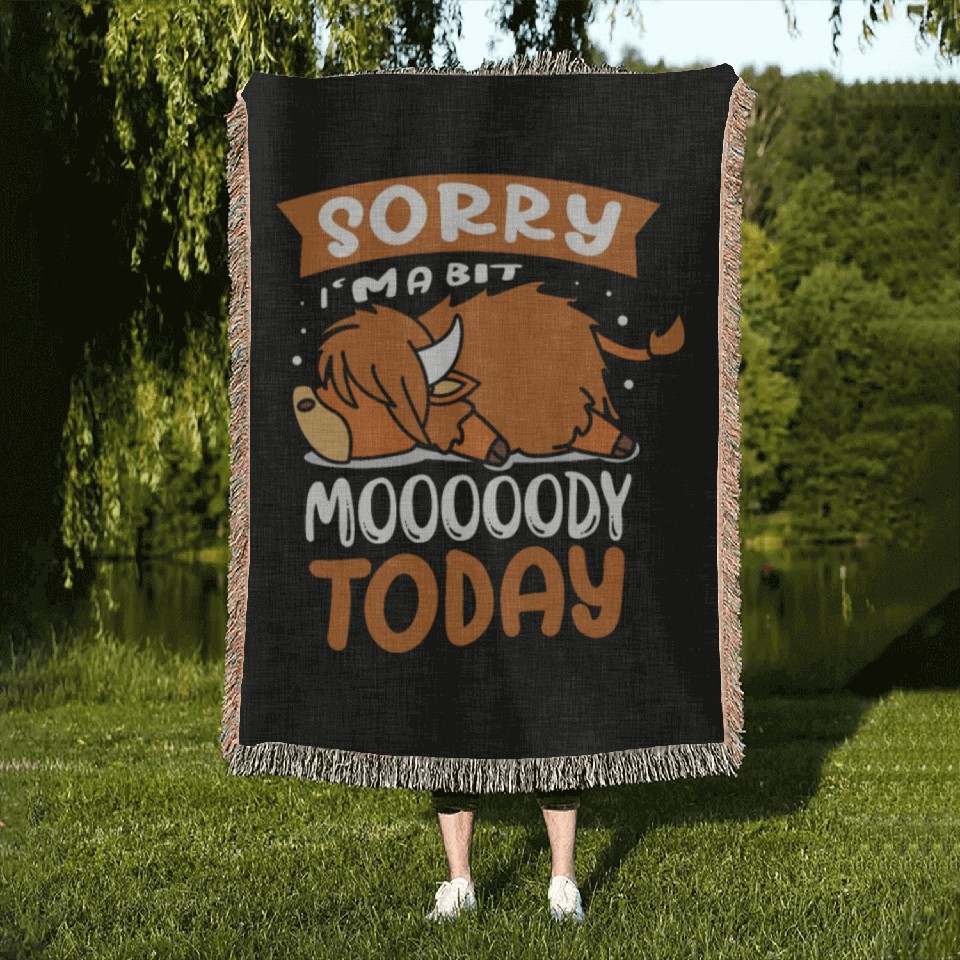 You are shopping for a stunning and trendy product Sorry I'm A Bit Moody Today Highland Cow Woven Blankets For Black belong theme Woven Blankets at Printblur