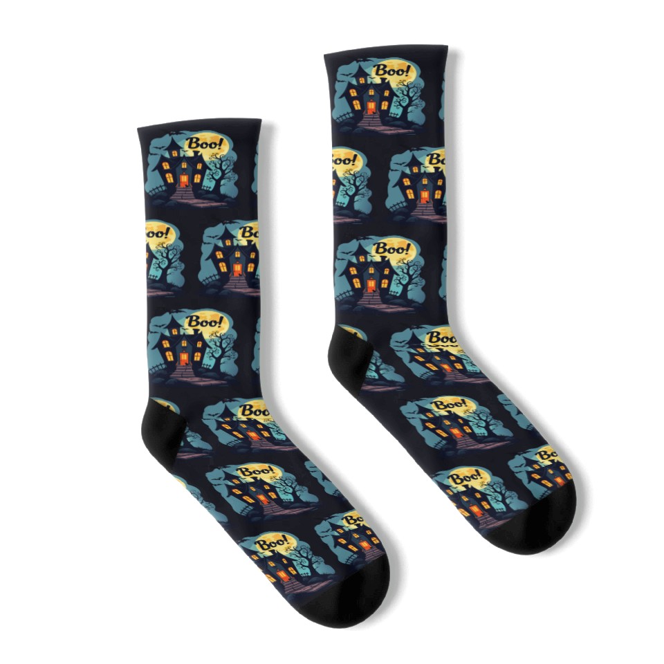 You are viewing an exclusive and elegant product spooky haunted house with a black cat sitting Socks For Black belong theme Socks at Printblur