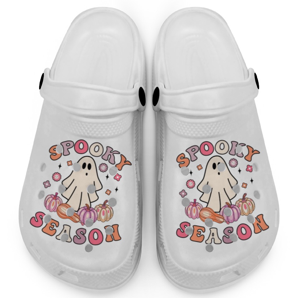 You are viewing an exclusive and elegant product Spooky Season Cute Retro Pumpkin Ghost Gift Kids Clogs For Kids WHITE belong theme Clogs at Printblur
