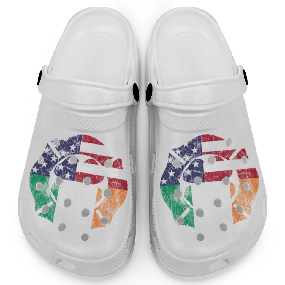 You are viewing an exclusive and elegant product St Patricks Day Firefighter Irish American Flag Clogs For Kids WHITE belong theme Clogs at Printblur