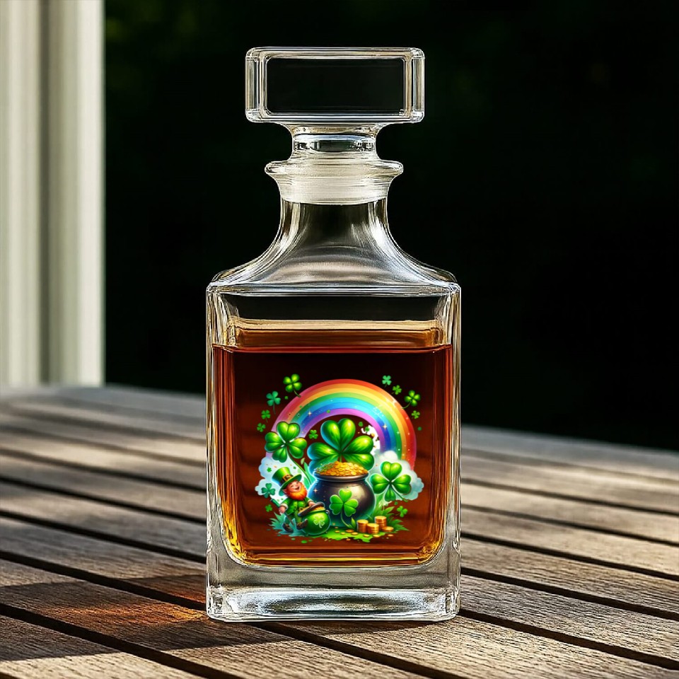 You are viewing an exclusive and elegant product St. Patrick's Day Shamrock Pot Gold Rainbow Whiskey Decanters For belong theme Whiskey Decanters at Printblur