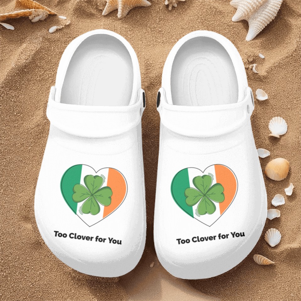You're searching for a one-of-a-kind product St Patrick's Nurse Clogs design 'Too Clover for You' For Men WHITE belong theme Nurse Clogs at Printblur