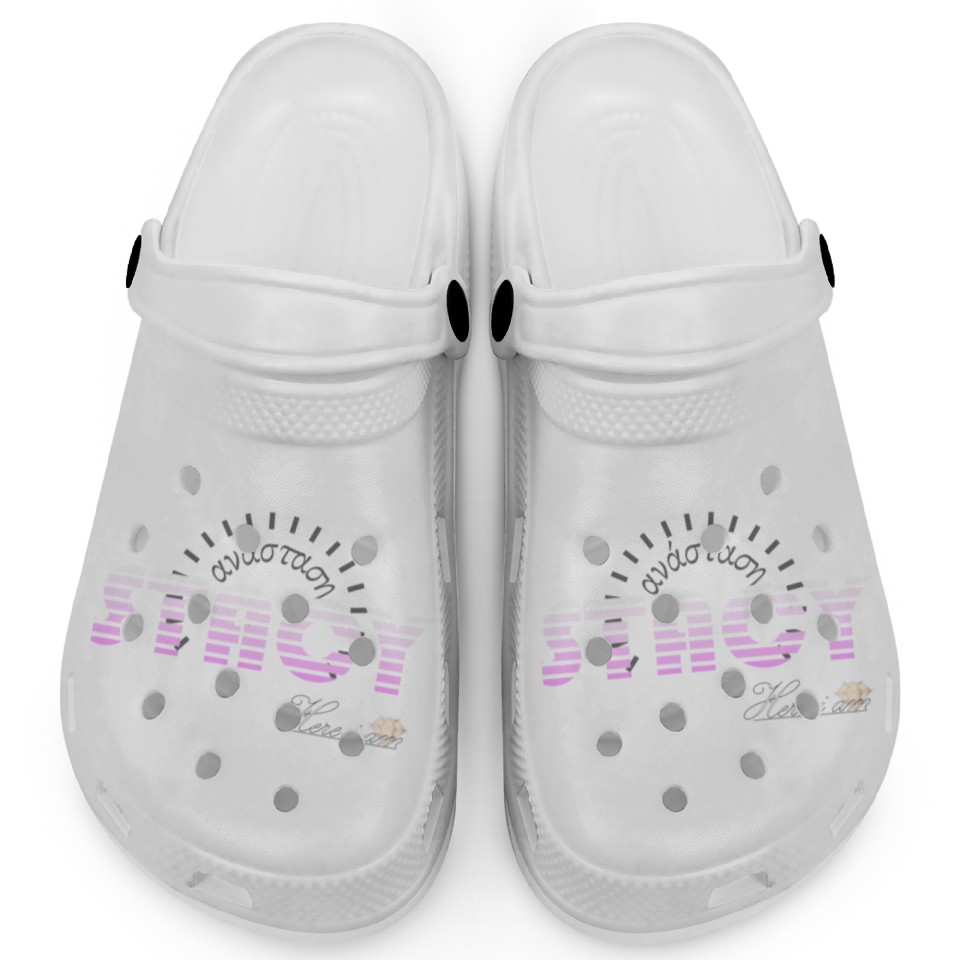 Buy eye-catching Stacy pink white, etymology of Greek origin. Clogs or see more Clogs products at Printblur shop now to explore many surprises from our shop!