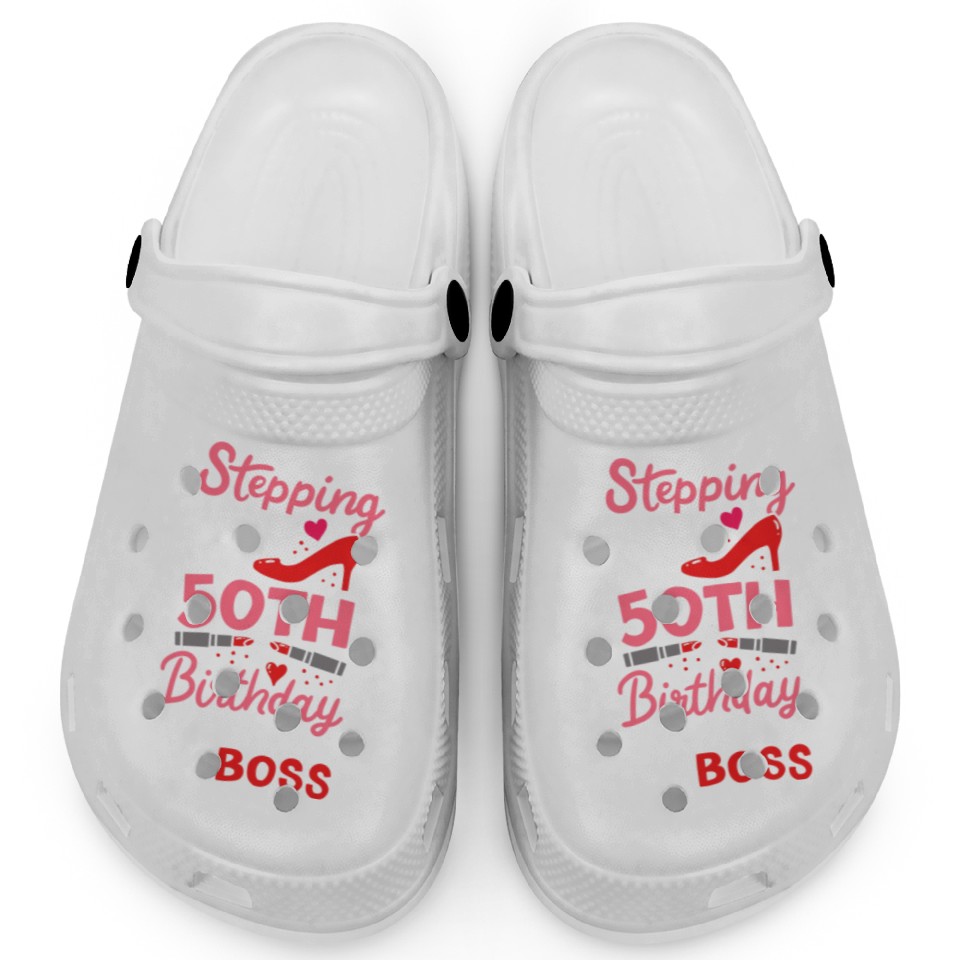 Shop for attractive Stepping Into My 50th Birthday Like A Boss Gift Clogs or see more Clogs products on https://printblur.com right now!