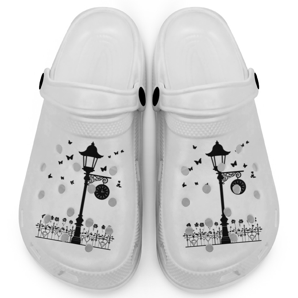 You are viewing an exclusive and elegant product Street Lamp with Clock and Butterflies Silhouette Clogs For Kids WHITE belong theme Clogs at Printblur