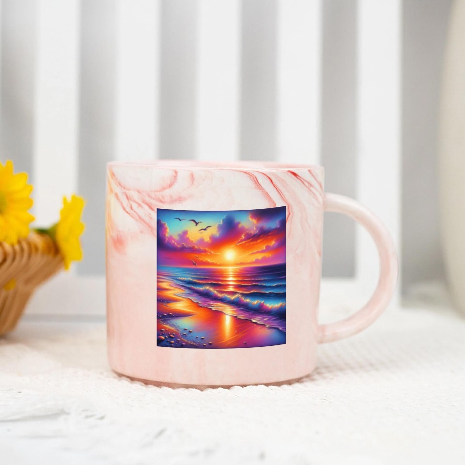 You are shopping for a stunning and trendy product Sunset Serenity: Pastel Beachscape Marble Mugs For Pink belong theme Marble Mugs at Printblur