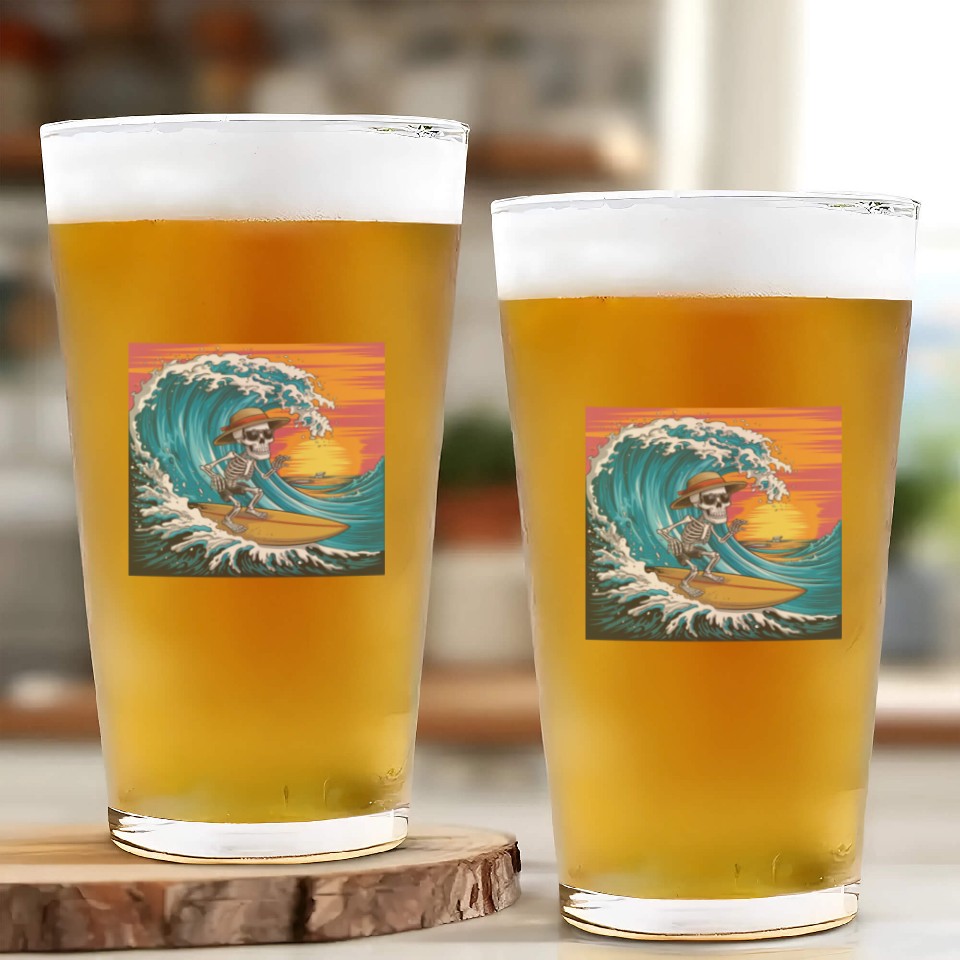 You're searching for a one-of-a-kind product Surfing Skeleton Vibes Surfing Lifestyle Retro Glass Cups For belong theme Glass Cups at Printblur