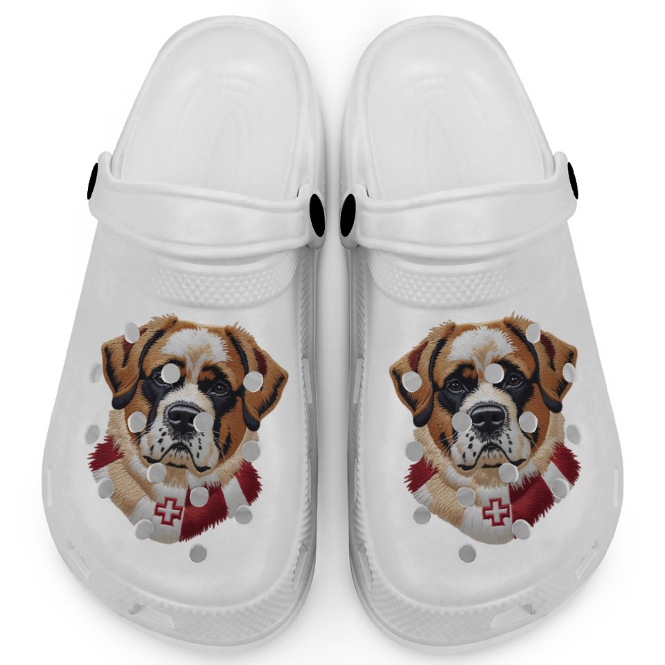 You're taking a peek at the product Swiss Saint Bernard Dog Red White Switzerland Flag Clogs For Kids WHITE belong theme Clogs at Printblur