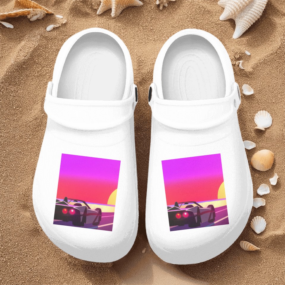 You're taking a peek at the product Synthwave Outrun Sports Car Beach Sunset Nurse Clogs For Men WHITE belong theme Nurse Clogs at Printblur