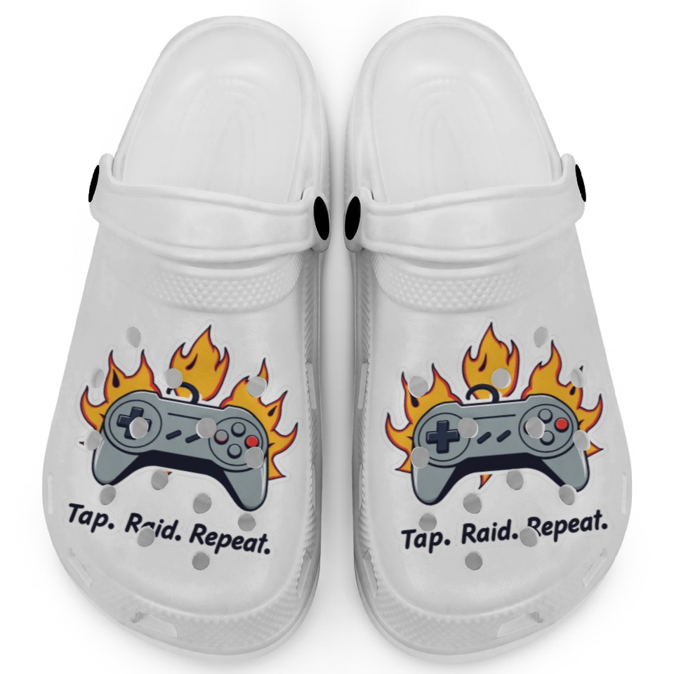 You are viewing one of the trendiest products Tap. Raid. Repeat. – Retro Gamer Controller On Fir Clogs For Kids WHITE belong theme Clogs at Printblur