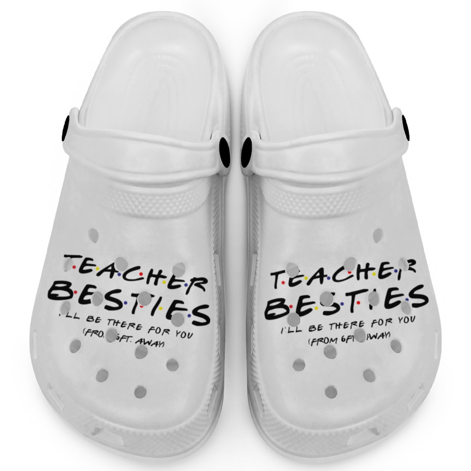 You are viewing an exclusive and elegant product Teacher Besties I ll Be There For You Clogs For Kids WHITE belong theme Clogs at Printblur