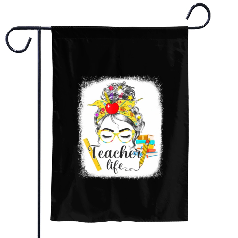 Buy eye-catching Teacher Life Messy Bun Back To School - First Day Garden Flags or see more Garden Flags products at Printblur shop now to explore many surprises from our shop!