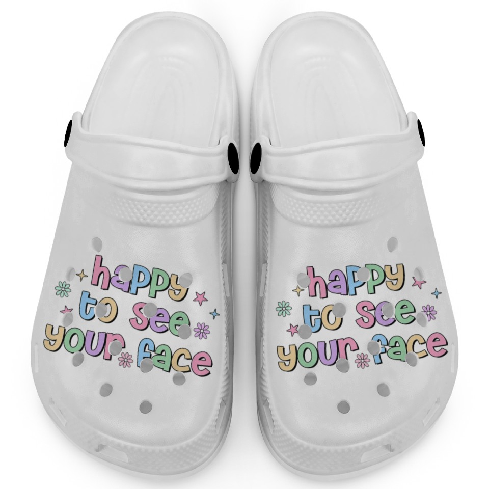 You're looking at the eye-catching product Teacher Team Happy To See Your Face Back To School Clogs For Kids WHITE belong theme Clogs at Printblur