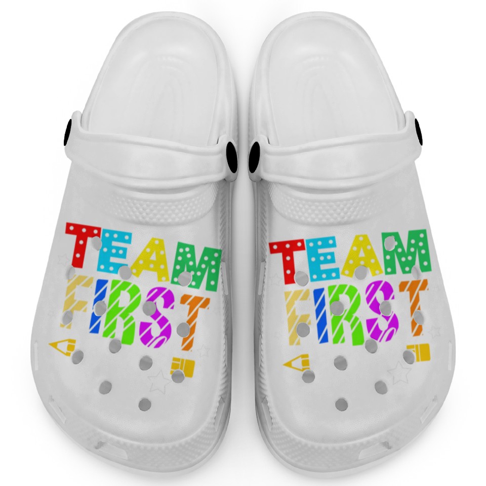 Buy eye-catching Team First Grade For Elementary Teacher Clogs or see more Clogs products at Printblur shop now to explore many surprises from our shop!