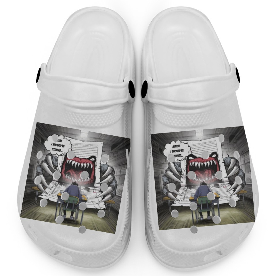 You're searching for a one-of-a-kind product Test Anxiety Student vs Exam Monster Exam Struggle Clogs For Kids WHITE belong theme Clogs at Printblur