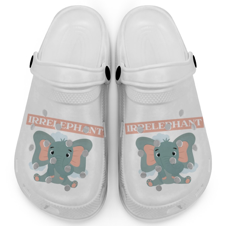 You're taking a peek at the product That Is Irrelephant Elephant Lover Wildlife Animal Clogs For Kids WHITE belong theme Clogs at Printblur