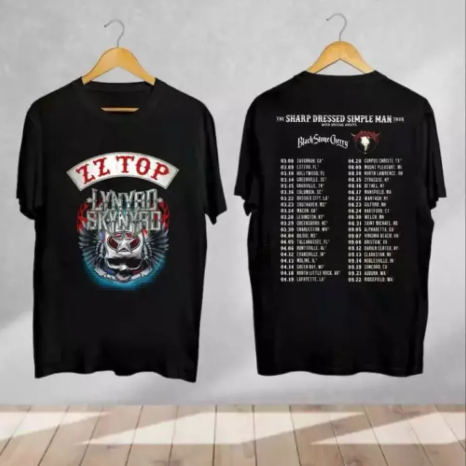 The item hot trend you're looking at is The Sharp Dressed Simple Man ZZ Top & Lynyrd Skynyrd Tour 2024 Shirt For Men Black belong theme Double Sided T-Shirts at Printblur
