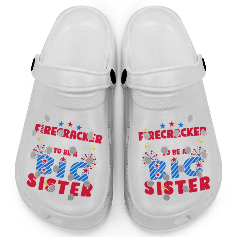 You're searching for a one-of-a-kind product This Little Firecracker is going to be Big Sister Clogs For Kids WHITE belong theme Clogs at Printblur