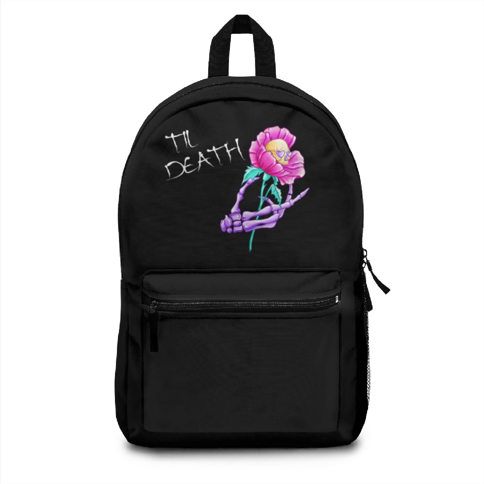 You are viewing one of the trendiest products Til Death Valentine Skeleton Hand Skull Flower Backpacks For Black belong theme Backpacks at Printblur