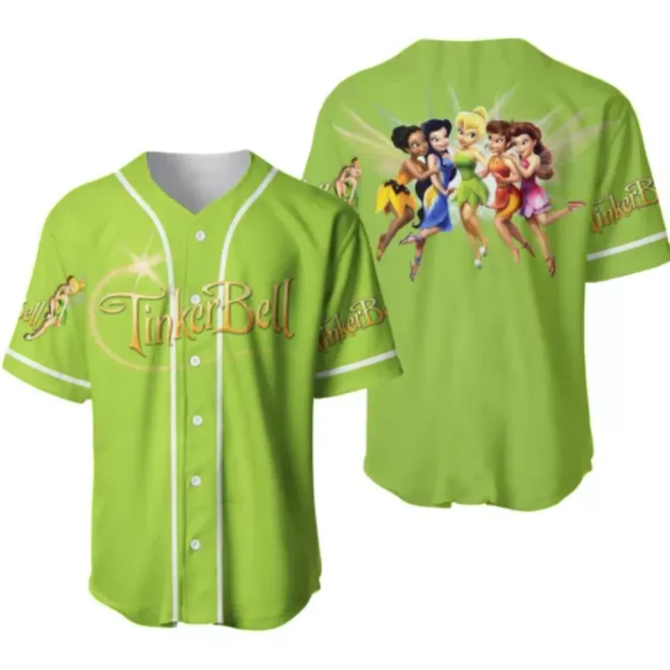 The product unique design you searched for is Tinker Bell Baseball Jersey Button Down Shirt, Tinker Bell Fairy Baseball Jersey For Men belong theme Baseball Jerseys at Printblur