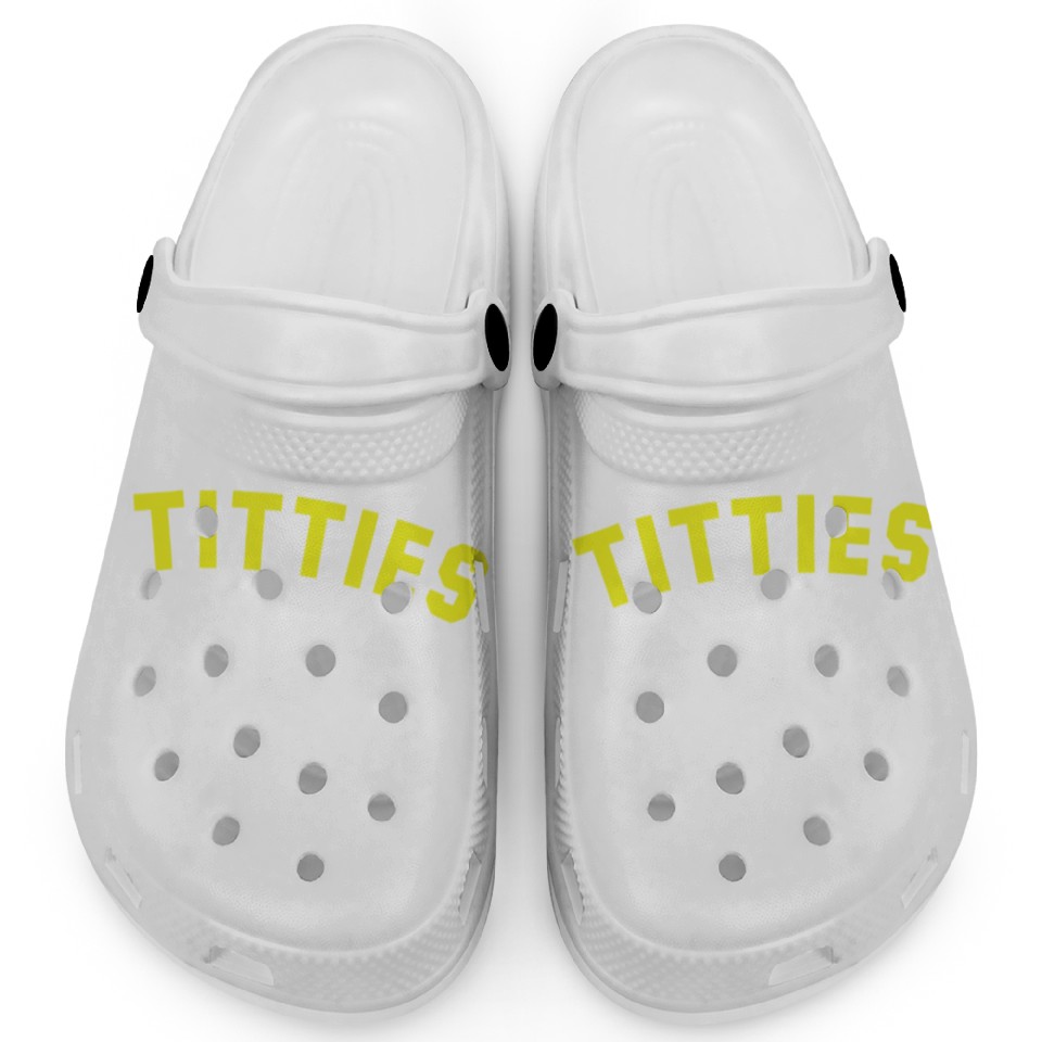 The item hot trend you're looking at is Titties Make Me Giddy Clogs For Kids WHITE belong theme Clogs at Printblur
