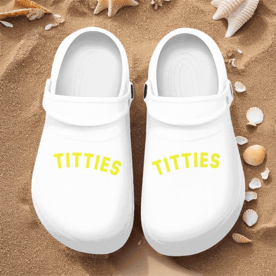 You are shopping for a stunning and trendy product Titties Make Me Giddy Nurse Clogs For Men WHITE belong theme Nurse Clogs at Printblur
