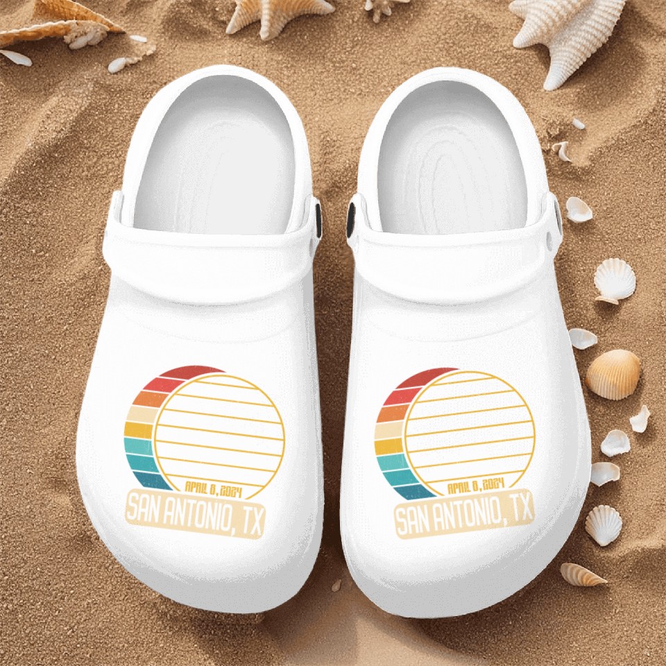 The product unique design you searched for is Total Solar Eclipse Texas San Antonio EclipseSan A Nurse Clogs For Men WHITE belong theme Nurse Clogs at Printblur