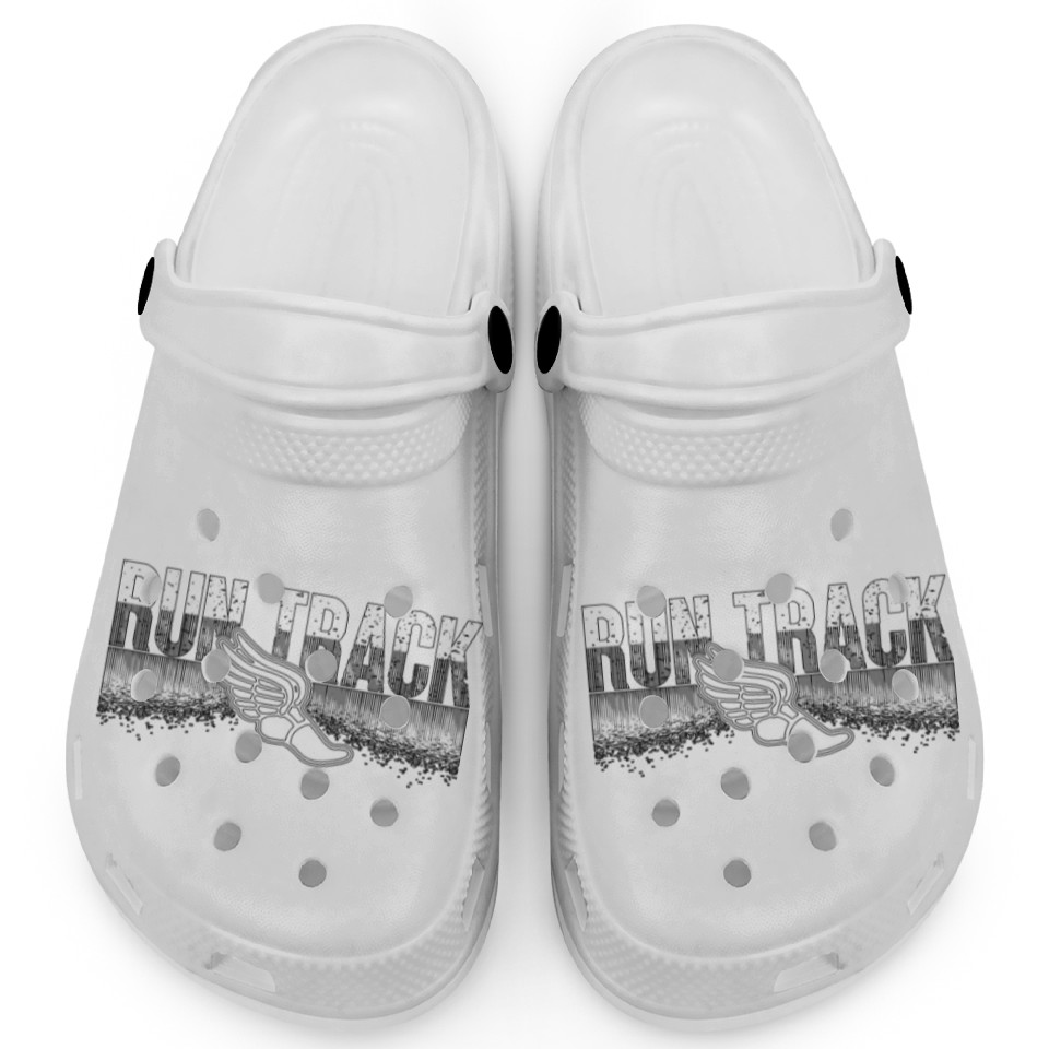 The product unique design you searched for is Track And Field Run Track Loves Running Athletic Clogs For Kids WHITE belong theme Clogs at Printblur