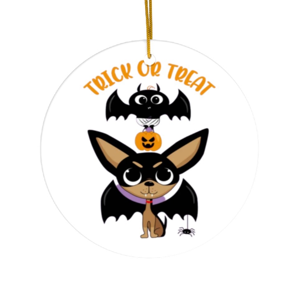Shop for attractive Trick-or-treating Vampire Chihuahua with Bat Ceramic Ornaments or see more Ceramic Ornaments products on https://printblur.com right now!
