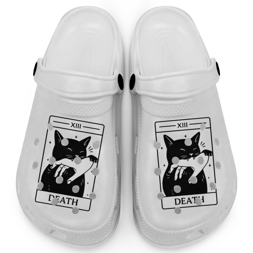 The product unique design you searched for is Death Tarot Cat, Funny Dark Humor, Occult Clogs For Kids WHITE belong theme Clogs at Printblur