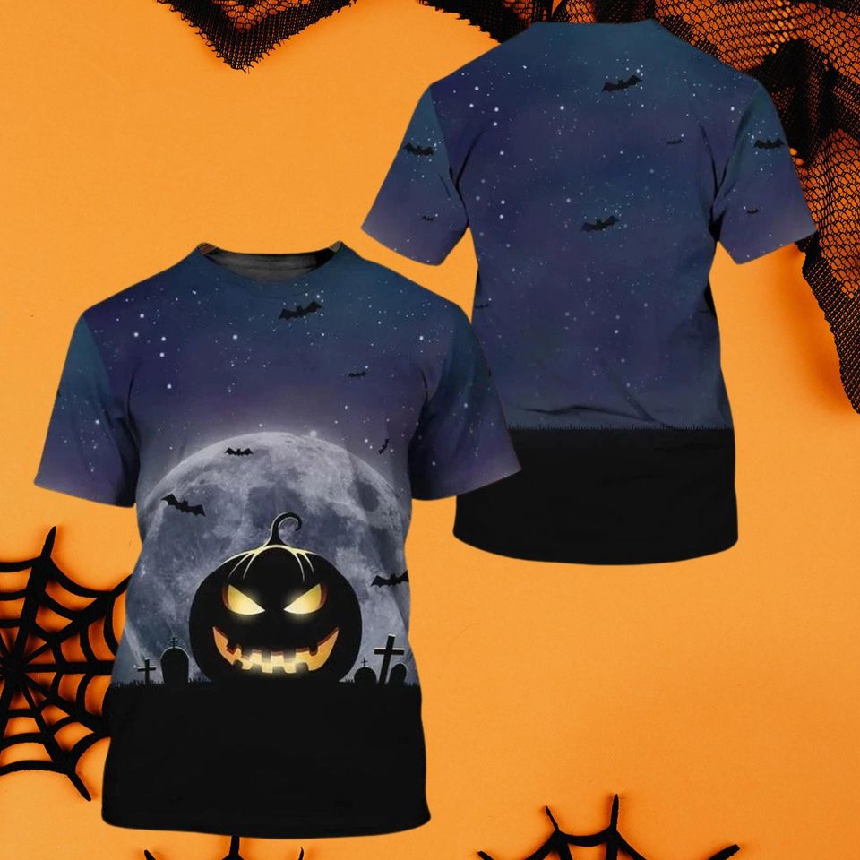 Buy eye-catching Glowing Jack O Lantern Moon Halloween T-Shirt for Adults, Graveyard Night Bats Graphic Tee or see more 3D T Shirts products at Printblur shop now to explore many surprises from our shop!