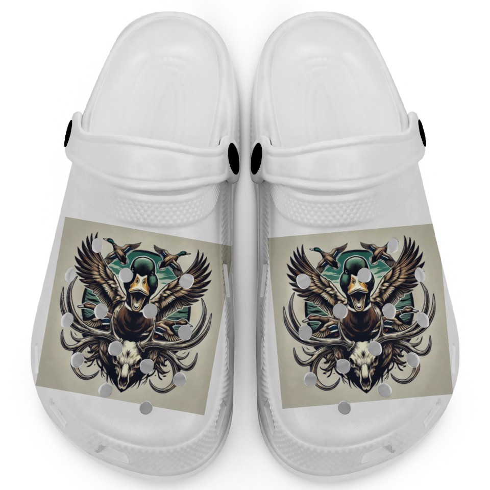 You're searching for a one-of-a-kind product Mallard duck flying over deer skull in marsh Clogs For Kids WHITE belong theme Clogs at Printblur