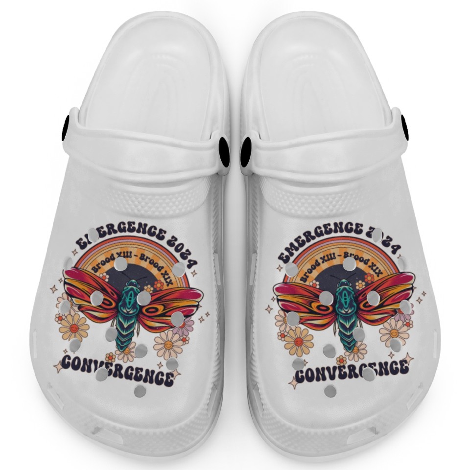 You're searching for a one-of-a-kind product Retro Flying Insects Invasion Cicada Tour 2024 Clogs For Kids WHITE belong theme Clogs at Printblur