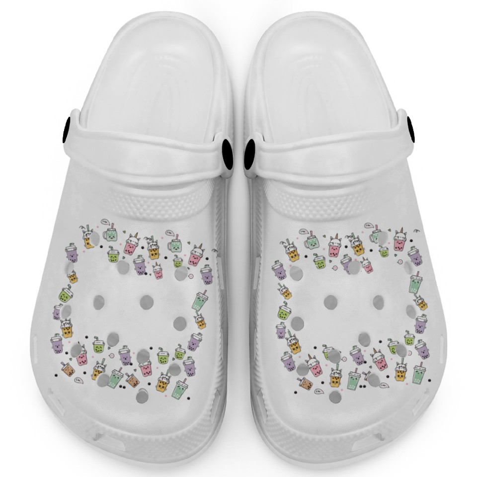 You're taking a peek at the product Skeletal Embrace: A Bubble Tea Love Story Clogs For Kids WHITE belong theme Clogs at Printblur