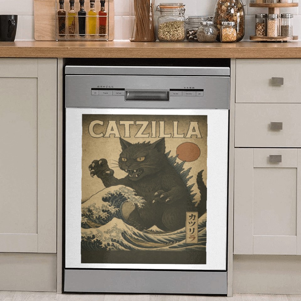 You are contemplating one of the best-selling products Ukiyo-e Catzilla Retro Japanese Monster Cat Dish Washer Covers For WHITE belong theme Dish Washer Covers at Printblur