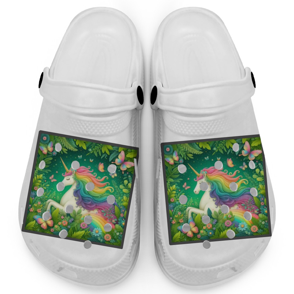 You are shopping for a stunning and trendy product Unicorn, Unicorn butterfly in flower garden design Clogs For Kids WHITE belong theme Clogs at Printblur