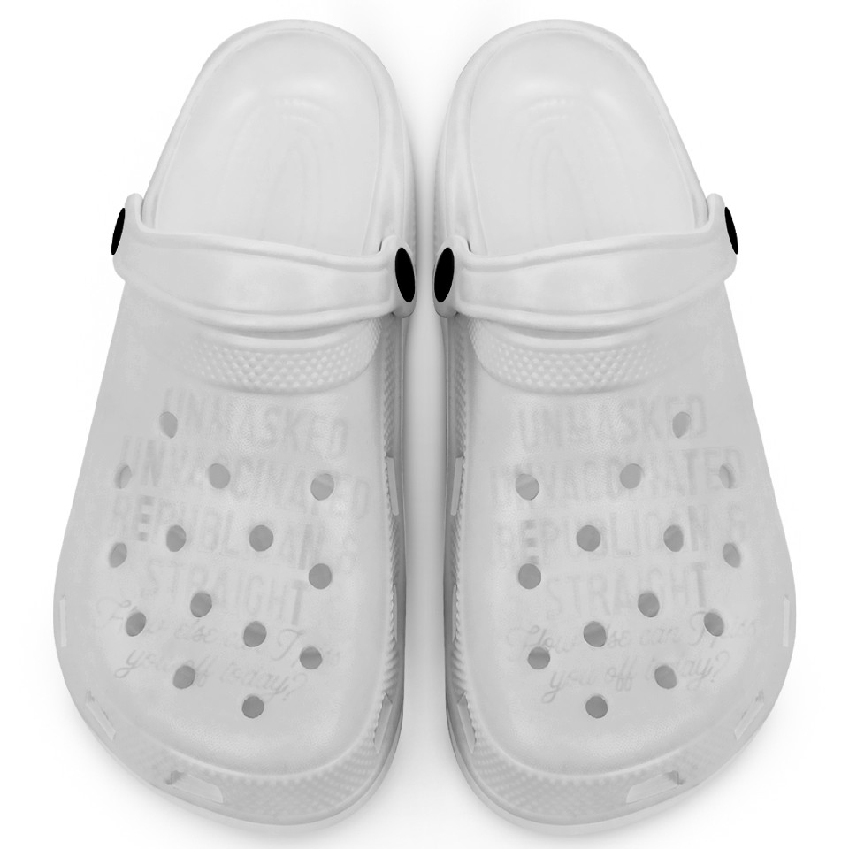 Shop for attractive Unmasked Unvaccinated Republican Straight Funny Clogs or see more Clogs products on https://printblur.com right now!