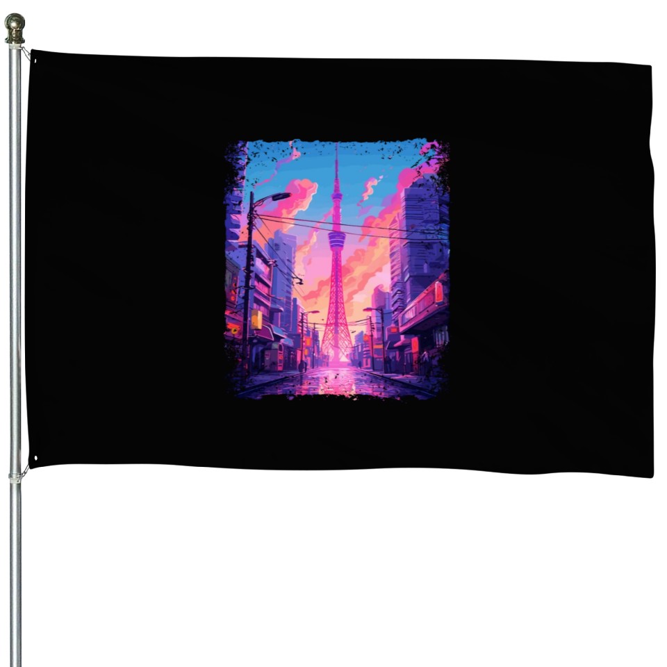 Own fascinating Vaporwave Aesthetic Japanese Skytree Tokyo Sight House Flags or see more House Flags products now from Printblur shop to enjoy your shopping time!