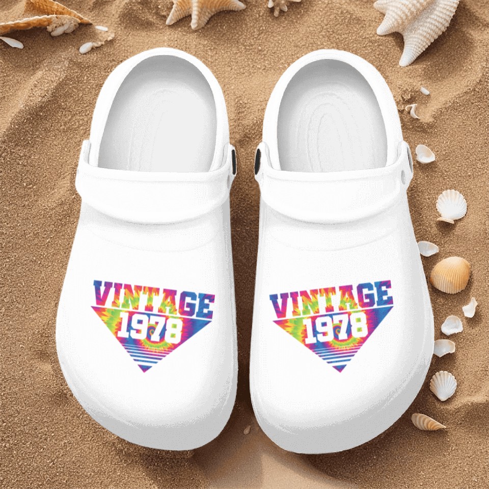 You're searching for a one-of-a-kind product Vintage 1978 Tie Dye Splash Color Triangle Nurse Clogs For Men WHITE belong theme Nurse Clogs at Printblur
