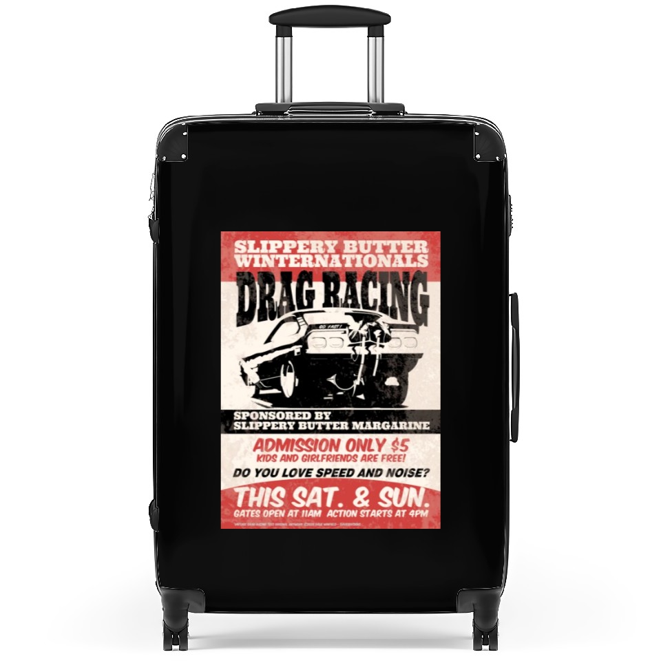 The product unique design you searched for is Vintage Hot Rod Classic Drag Racing Poster Suitcases For Black belong theme Suitcases at Printblur